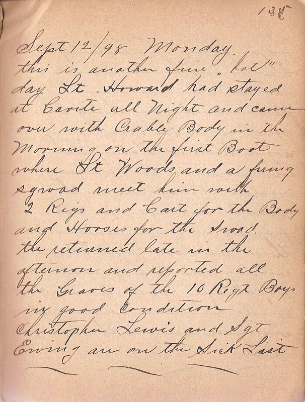 this is another fine "hot" day Lt. Howard had stayed at Cavite all Night and came over with Crable Body in the Morning on the first Boat where Lt Woods and a firing squad meet him with 2 Rigs and Cart for the Body and Horses for the Swad the returned late in the afternoon and reported all the Graves of the 10 Regt Boys in good condition Christopher Lewis and Sgt Ewing are on the Sick List |