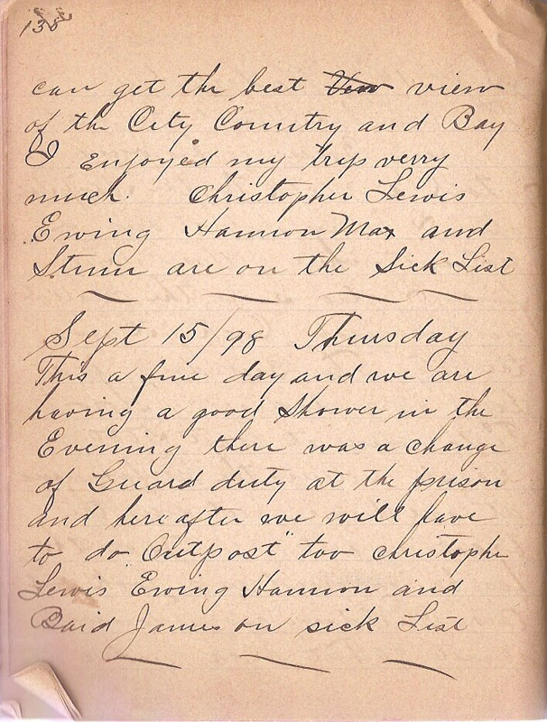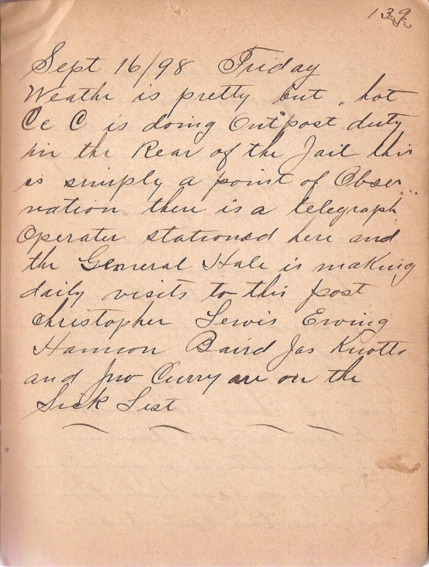 Weathr is pretty but hot Co C is doing Outpost duty in the Rear of the Jail this is simple a point of Observation there is a telegraph Operator stationed here and the General Hale is making daily visits to this post Christopher Lewis Ewing Hannon Baird Jas Knotts and Jno Curry are on the Sick List |