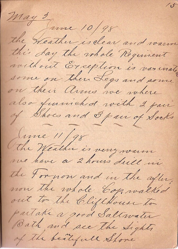 from this day until June the 10th we went through our regular routine Buisnes 4 hours drill a day and Dressparade in the Evenings with the Exception of Sunday on wich the Visitors just crowded our Camp so that we scarcily had Room to walk around we recieved good Meals and plenty of Delacasis from the many Ladie Visitor all this time it has being very warm during the day but the Nights are quiet chilly and damp |