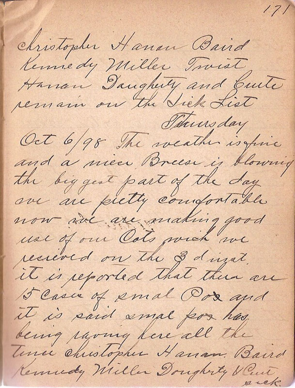 The weather is fine and a niece Breese is blowing the biggest part of the day we are pretty comfortable now we are making good use of our Cots wich we recieved on the 3 d it is reported that there are 15 cases of smal pox has being ravnig here all the time Christopher Hanan Baird Kennedy Miller Dougherty & Cuite sick