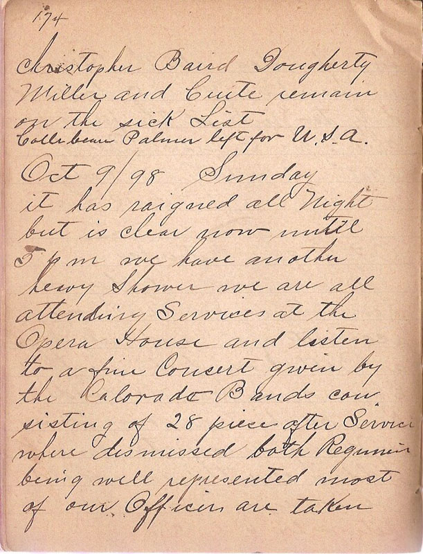 it has raigned all Night but is clear now until 3 p.m. we have another heavy Shower we are all attending Services at the Opera House and listen to a fine Concert given by the Colorado Bands consisting of 28 piece after Service where dismissed both Regiment being well represented most of our Officers are taken |