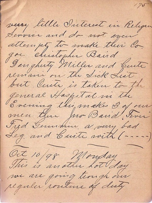 verry little Interest in Religion Service and do not even attempt to make their Co goe christopher Baird Daugherty Miller and Cuite remain on the Sick List but Cuite is taken to teh general Hospital in the Evening this makes 3 of our men there Jno Baird "Fever" Fred Germiwine a verry bad Leg and Cuite with (-----)
