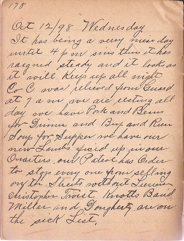 It has being a very nice day until 4 pm sins then it has raigned steady and it looks as it will Keep up all night Co C was relieved from Guard at 7 am we are resting all day we have Pork and Beans for Dinner and Beef and Rice Soup for Supper we have our new Lambs fixed up in our Quarters. our Patrol has Order to stop every one from selling on the Streets without Licens Christopher Twtis Knotts Baird Miller and Dougherty are on the sick List |