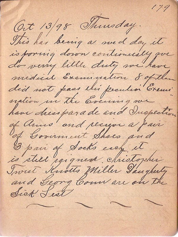 This has being a wed day it is poring down continusly we do verry little duty we have medical Examination 8 of them did not pass this peculiar "Exam" we have dressparade and Inspection of Arms and recieve a pair of Government Shoes and 3 pair of Socks each it is still raigned Christopher Twist Knotts Miller Daugherty and Georg Conn are on the Sick List |