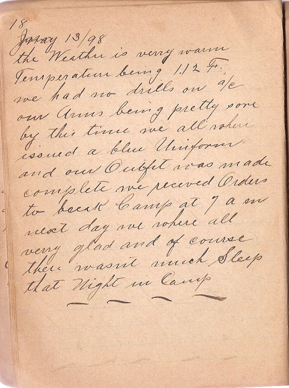the Weather is verry warm Temperature being 112 F we had no drills on a/c our Arms being pretty sore by this time we all where issued a blue Uniform and our Outfit was made complete we receved Orders to break Camp at 7 am nesct day we where all verry glad and of course there wasnt much Sleep the Night in Camp |