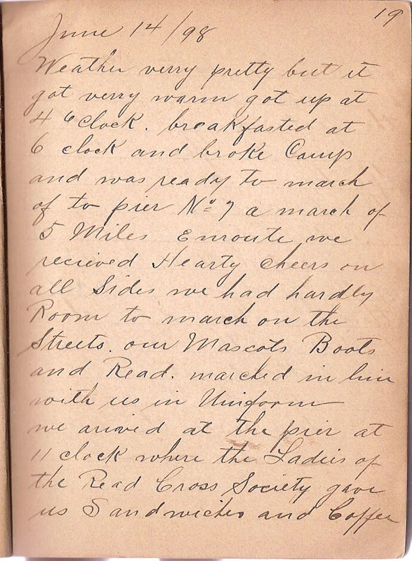 Weather verry pretty but it got very warn got up at 4 o clock. breakfasted at 6 clock and broke Camp and was ready to march of to pier No 7 a march of 5 Miles enroute we recieved Hearty cheers on all Sides we had hardly Room to march on the Streets our Mascots Boots and Read marched in line with us in Unifrom we arived at the pier at 11 clock where the Ladies of the Red Cross Society gave us Sandwiches and Coffee |
