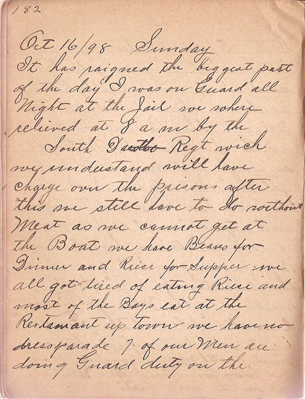 It has raigned the biggest part of the day I was on Guard all Night at the Jail we where relieved at 8 am by the South Dacota Regt wich we understand will have charge over the prisons after this we still have to do without Meat as we cannot get at the Boat we have Beans for Dinner and Rice for Supper and most of the Boys eat at the Restaurant up town we have no dressparade 7 of our Men are doing Guard duty on the |