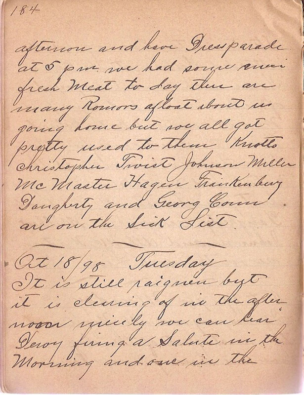 afternon and have Dressparade at 5 pm we had some nice fresh Meat to day there are many Rumors afloat about us going home but we all got pretty used to them Knotts Christopher Twist Johnson Miller McMaster Hagen Frankenbery Daugherty and Georg Conn are on the Sick List
