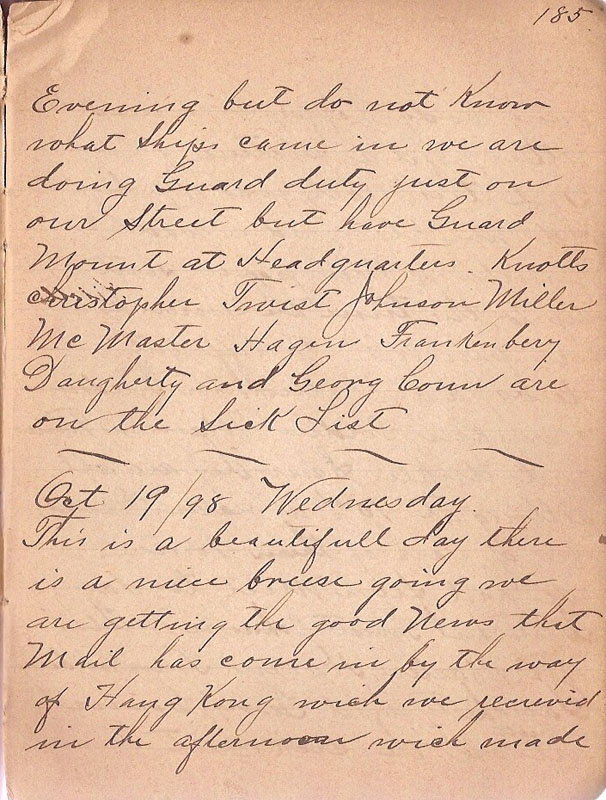Evening but do not Know what Ships came in we are doing Guard duty just on our Street but have Guard Mount at Headquarters Knotts Christopher Twist Johnson Miller McMaster Hagen Frankenbery Daugherty and Georg Conn are on the Sick List