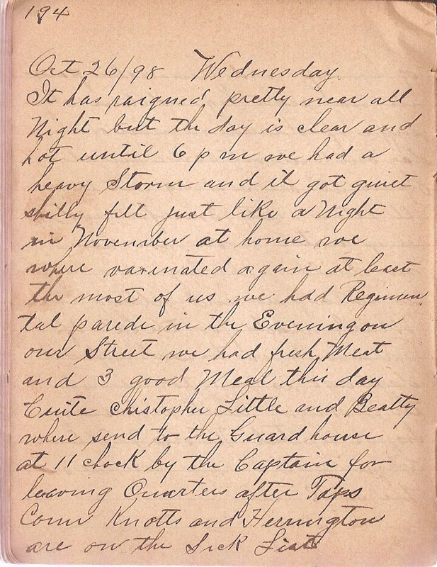 It has raigned pretty near all Night but the day is clear and hot until 6 pm we had a heavy Storm and it got quiet chilly fell just like a Night in November at home we where vaxinated again at least the most of us we had Regimental parade in the Evening on our Street we had fresh Meat and 3 good Meal this day Cuite christopher Little and Beatty where send to the Guard house at 11 clock by the Captain for leaving Quarters after Taps Conn Knotts and Herrington are on the Sick List |