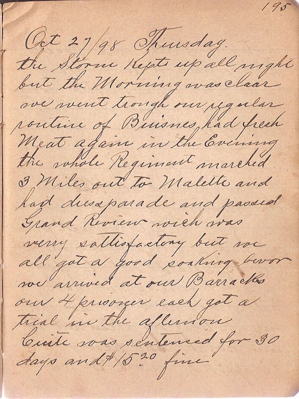 the Storm Kept up all night but the Morning was clear we went trough our regular routine of Buisnes had fresh Meat again in the Evening the whole Regiment marched 3 Miles out to Malette and had dressparade and passed Grand Review wich was verry sattisfactory but we all got a good soaking befor we arrived at our Barracks our 4 prisoner each got a trial in the afternon Cuite was was sentensed for 30 days and $15.20 fine |