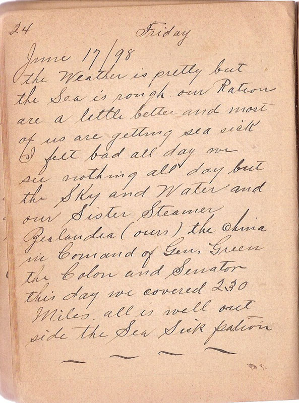 the Weather is pretty but the Sea is rough out Ration are a little better and most of us are getting sea sick I felt bad all day we see nothing all day but the Sky and Water and our Sister Steamer Zealandia (ours) the china in Comand of Gen. Green the Colon and Senator this day we coverd 230 Miles all is well outside the Sea Sick portion |