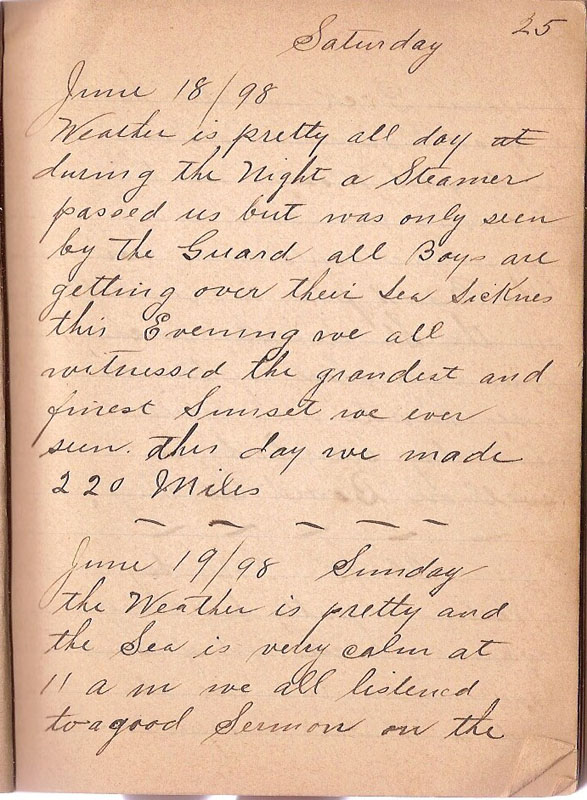 Weather is pretty all day at during the Night a Steamer passed us but was only seen by the Guard all Boys are getting over their Sea Sickness this Evening we all witnessed the grandest and finest Sunset we ever seen this day we made 220 Miles