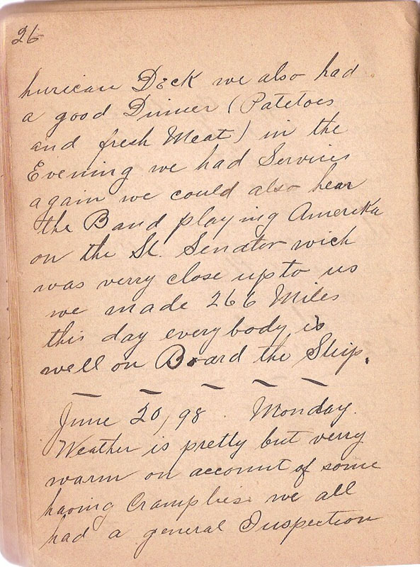 huricane Deck we also had a good Dinner (Patetoes and fresh Meat) in the Evening we had Services again we could also hear the Band playing Amerika on the Sl Senator wich was very close up to us we made 266 Miles this day everybody is well on Board the Ship.