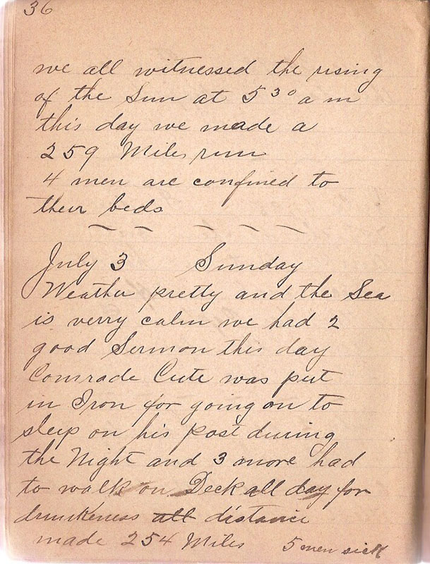 Weather pretty and the Sea is verry calm we had 2 good Sermon this day Comrade Cute was put in Iron for going on to sleep on his post during the Night and 3 men had to walk on Deck all day for drunkeness all distance made 254 Miles 5 men sick |