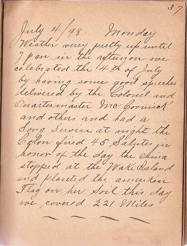 Weather verry pretty up until 7 pm in the afternoon we celebrated the 4th of July by having some good speeches delivered by the Colonel and Quartermaster McCormick and others and had a Song Service at night the Colon fired 45 Salutes in honor of the day the china stopped at the Wake Island and planted the Amerikan Flag on her Soil this day we covered 221 Miles |