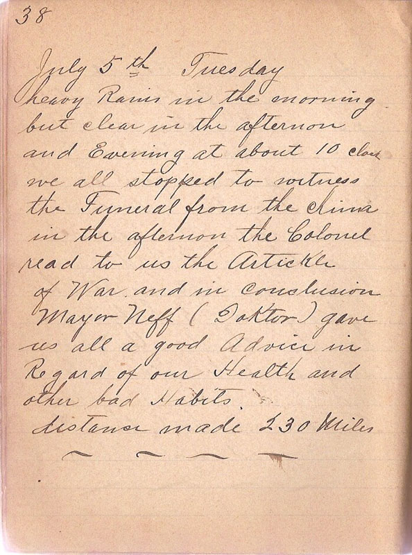 heavy Rains in the morning but clear in the afternoon and Evening at about 10 clock we all stopped to witness the Funeral from the china in the afternoon the Colonel read to us the Artikle of War and in conclusion Mayor Neff (Doktor) gave us all a good Advicce in Regard of our Health and other bad Habits. distance make 230 Miles