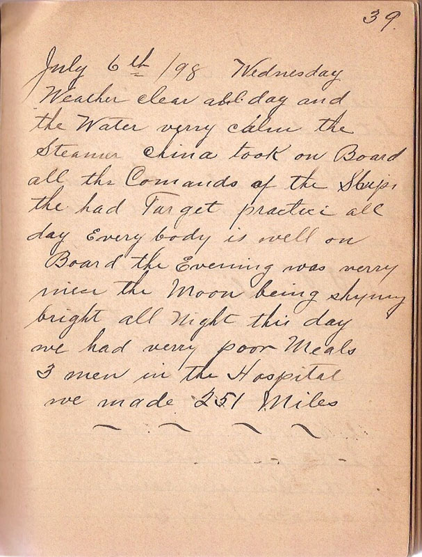 Weather clear all day and the Water verry calm the Steamer china took on Board all the Comrades of the Ship the had Target practice all day everybody is well on Board the Evening was verry nicer the Moon being shining bright all Night this day we had verry poor Meals 3 men in the Hospital we made 251 Miles