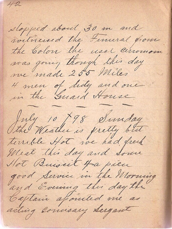 the Weather is pretty but terrible Hot we had fresh Meat this day and some Hot Biscuit 4 a piece good Service in the Morning and Evening this day the Captain apointed me as acting comisary Sergeant |