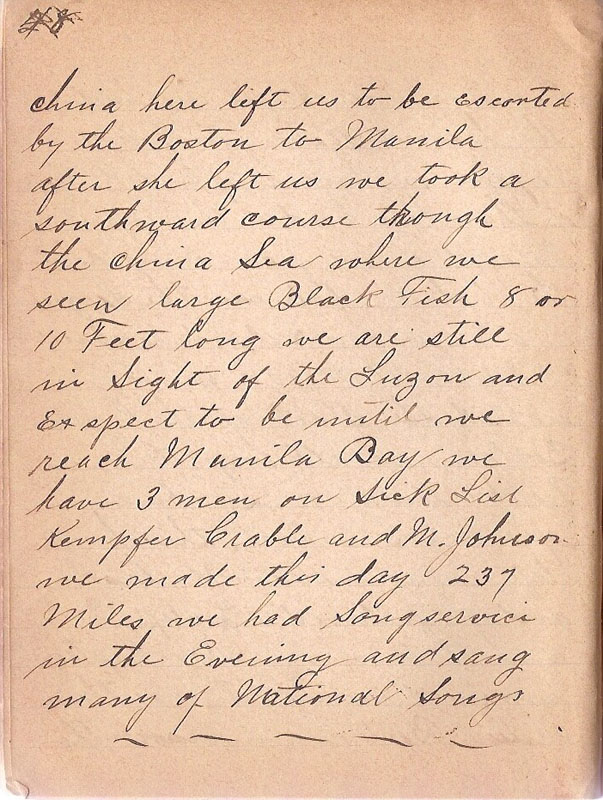 | china here left us to be escorted by the Boston to Manila after she left us we took a southward course trough the china Sea where we seen large Black Fish 8 or 10 Feet long we are still in sight of the Luzon and exspect to be until we reach Manila Bay we have 3 men on Sick List Kempfer Crable and M. Johnson we made this day 237 Miles we had Songservice in the Evening and sang many of National Songs |