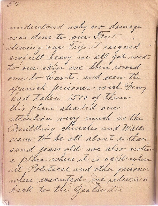 understand why no damage was done to our Fleet during our Trip it raigned awfull heavy we all got wet to our skin we their rowed over to Cavite and seen the spanich prisoner wich Dewy had taken 1500 of them this place atracted our attention very much as the Building churches and Walls seem to be all about a thousand years old we also noticed a place where it is said when all Political and other prisoners where executed we returned back to the Zealandia the same 3 men are still sick all others are well and are seemingly good Spirit.