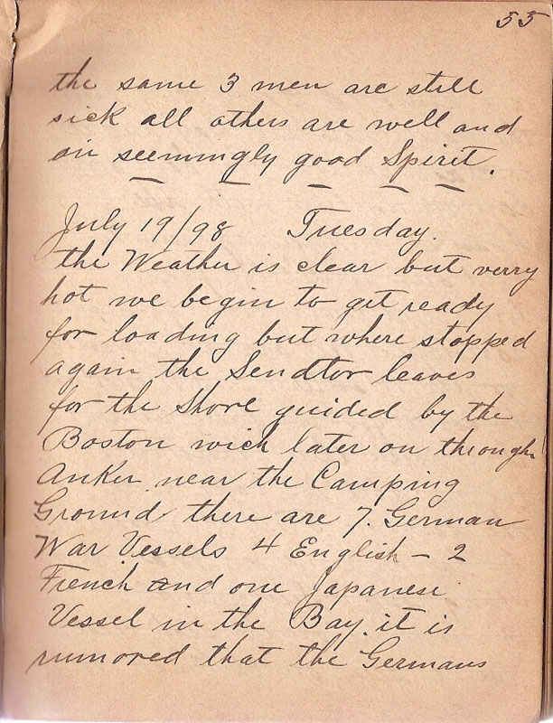 the Weather is clear but verry hot we begin to get ready for loading but where stopped again the Senator leaves for the Shore guided by the Boston wich later on through Anker near the Camping Ground there are 7 German War Vessels 4 English - 2 French and one Japanese Vessel in the Bay it is runored that the Germans
