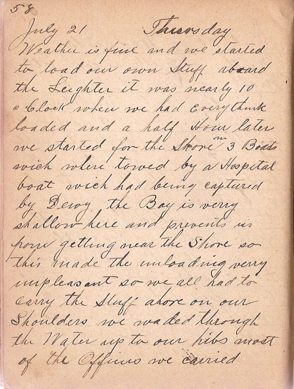 Weather is fine and we started to load our own stuff aboard the Leighter it was nearly 10 o Clock when we had everythink loaded and half Hour later we started for the Shore in 3 Boats wich where towed by a Hospital boat wich had being captured by Dewy the Bay is very shallow here and prevents us from getting near the Shore so this made the unloading verry unpleasant so we all had to carry the Stuff above on our Shoulders we waded through the Water up to our hips most of the Officers we carried |
