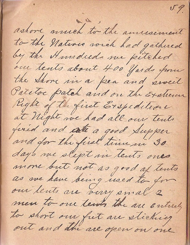 ashore much to the amusement to the Natives wich had gathered by the Hundreds we pitched our tents about 400 Yards from the Shore in a pea and sweet Potatoe patch and on the exstream Right of the first Exspedition at Night we had all our tents fixed and ate a good Supper and for the first time in 30 days we slept in tents ones more but not as good of tents as we have being used to for our tents are verry small 2 men to one tent the are entirely to short our feet are sticking out and the are open on one |