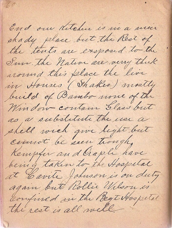 | End our Kitchen is in a nice shady place but the Rest of the tents are exsposed to the Sun the Natives are verry thick around this place the live in Houses (Shakes) mostly build of Bambo none of the Window contain Glass but as a substitute the use a shell wich give light but cannot be seen trough Kempfer and Craple have being taken to the Hospital at Cavite Johnson is on duty again but Rollie Wilson is confined in the Regt Hospital the rest is all well |
