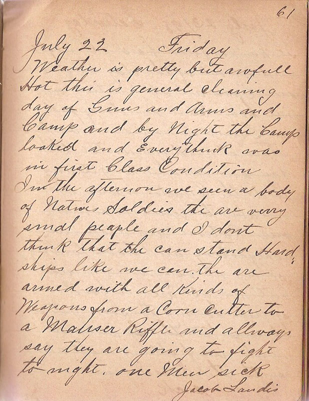 Weather is pretty but awfull Hot this is general cleaning day of Guns and Arms and Camp and by Night the Camp looked and everythink was in first Class Condition In the afternon we seen a body of Natives Soldiers the are verry smal people and I dont think that the can stand Hard ships like we can the are armed with all Kinds of Weapons from a Corn Cutter to a Mauser Riffle and allways say they are going to fight tonight one Men sick Jacob Landis |