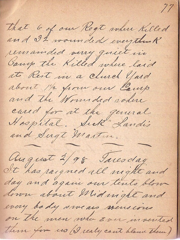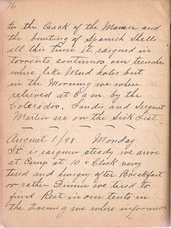 to the Crack of the Mauser and the busting of Spanish Shells all this time it raigned in torrents continuous our trenchs where like Mud holes but in the Morning we where relieved at 8 am by the Colerados. Landis and Sergeant Martin are on the Sick List