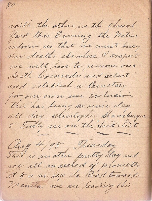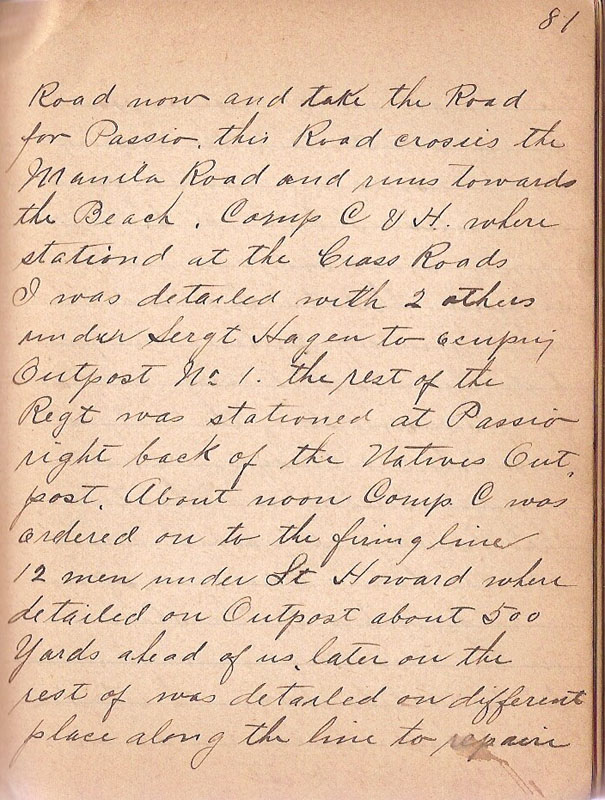 This is another pretty day and we all marched of promptly at 8 am up the Road towards Manila we are leaving this Road now and take the Road for Passio this Road crossis the Manila Road and runs towards the Beach. Comp C & H where stationed at the Cross Roads I was detailed with 2 others under Sergt Hagen to ocupy Outpost No 1 the rest of the Regt was stationed at Passio right back of the Natives Outpost. About noon Comp. C was ordered on to the firing line 12 men under Lt Howard where detailed on Outpost about 500 Yards ahead of us later on the rest of was detailed on different place along the line to repaire