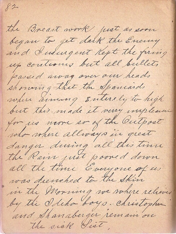 | the Breast work just as soon began to get dark the Enemy and Insurgent Kept the firing up continuous but all bullets passed way over our heads showing that the Spaniards where aiming entirely to high but this made it verry unpleasant for us more so of the Outpost who where allways in great danger during all this time the Rain just poored down all the time Everyone of us was drenched to the Skin in the Morning we where relieved by the Idaho boys. christopher and Shanaberger remain on the sick List |