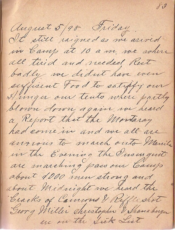 It still raigned as we arived in Camp at 10 am we where all tired and needed Rest badly we didnt even have even sufficient Food to satisfy our Hunger our tents where partly blown down again we heard a Report that the Montaray had come in and we all are anxious to march onto Manila in the Evening the Insugent are marching pass our Camp about 1000 men strong and about Midnight we hear the Cracks of Cannons & Riffle shot Georg Miller Christopher & Shanaberger are on the Sick List |