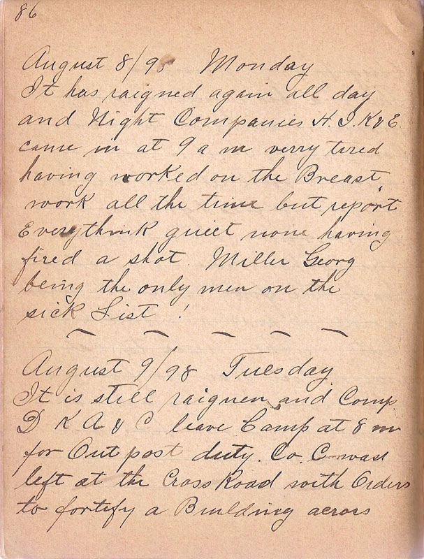 It has raigned again all day and Night Companies H.I.K & E came in at 9 am verry tired having worked on the Breast work all the time but report everythink quiet none having fired a shot. Miller Georg being the only men on the sick List!