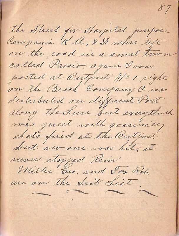 the Street for Hospital purpose Companies K A & D where left on the road in a smal town called Passio again I was posted at Outpost No 1 right on the Beach Company C was distributed on different Post along the Line but everythink was quiet with ocasinally shots fired at the Outpost but no one was hit it never stopped Rain Miller Geo and Fos Rob are on the Sick List |