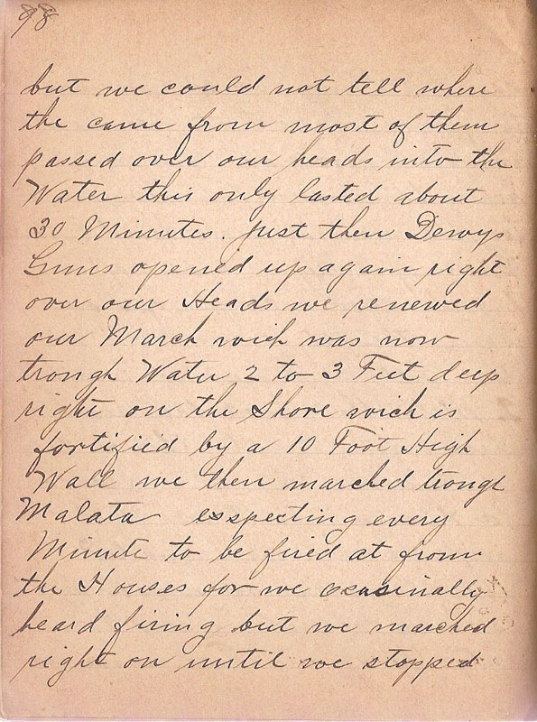 | but wecould not tell where the came from most of them passed over our heads into the Water this only lasted about 30 Minute just then Dewys Guns opened up again right over our Heads we renewed our March wich was now trough Water 2 to 3 Feet deep right on the Shore wich is fortified by a 10 Foot High Wall we then marched trough Malata especting every Minute to be fired at from the Houses for we ocasinally heard firing but we marched right on until we stopped |