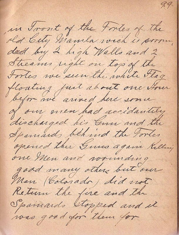 in Front of the Forte of the old City Manila wich is souronded by 2 high Walls and 2 Streams right on top of the Fortes we seen the white Flag floating just about one Hour befor we arived here some of our men had accidently discharged his Gun and the Spaniards behind the Fortes opened ther Guns again killing one Men and wounding good many others but our Men (Colorado) did not Return the fire and the Spaniards stopped and it was good for them for |