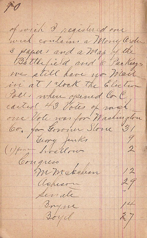 of wich I register one wich contains a Mony Order 3 papers and a Map of the Battlefield and 6 Packages we still have no Mail in at 1 Clock the Election Polls where opened Co C casted 43 Votes of wich one Vote was for Washington Co.