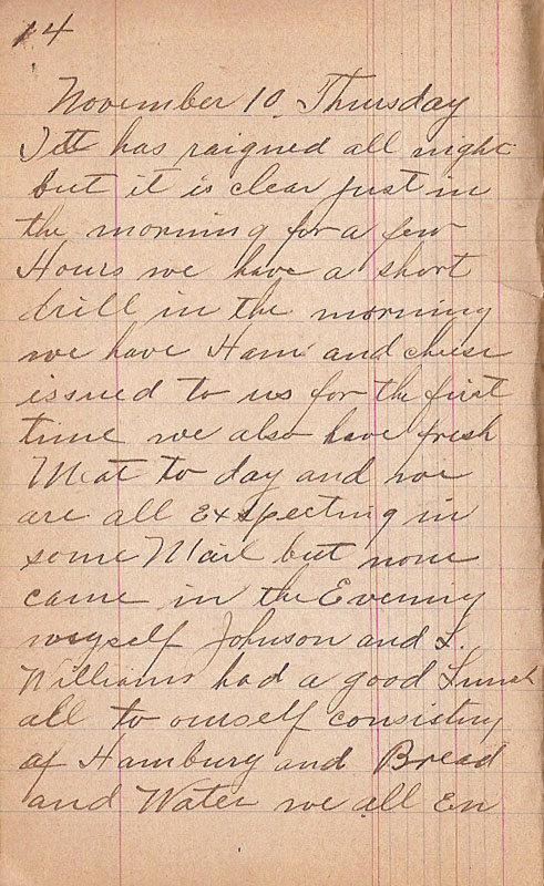 It has raigned all night but it is clear just in the morning for a few Hours we have a short drill in the morning we have Ham and cheese issued to us for the first time we also have fresh Meat to day and we are all exspecting in some Mail but none came in the Evening myself Johnson and L. Williams had a good Lunch all to ourself consisting of Hamburg and Bread and Water we all en- |
