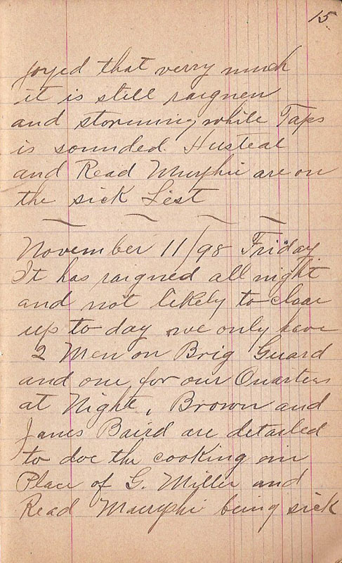 It has raigned all night and not likely to clear up to day we only have 2 men on Brig Guard and one on our Quarter at Night. Brown and James Baird are detached to doe the cooking in Place of G. Miller and Read Murphi being sick |