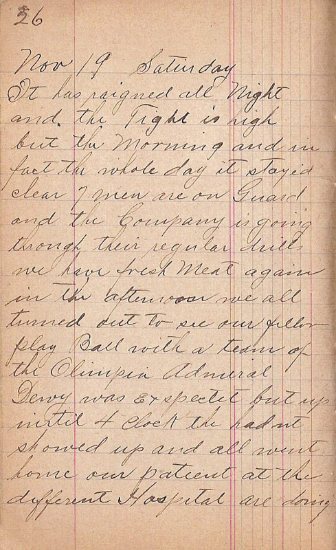 It had raigned all Night and the Fight is high but the Morning and in fact the whole day it stayed clear 7 men are on Guard and the Company is going through their regular drills we have fresh Meat again in the afternoon we all turned out to see our fellow play Ball with a team of the Olympia Admiral Dewy was exspected but up until 4 Clock the hadnt showed up and all went home our patient at the different Hospital are doing