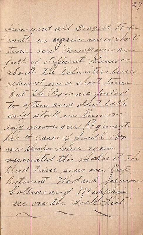 fine and all exspect to be with us again in a short time our Newspaper are full of different Rumors about the Volunters being relieved in a short time but the Boys are fooled to often and don’t take any stock in Rumors any more our Regiment has 4 cases of Smal Pox we therefor where again vaxinated this makes it the third time sins our entlistment Wodard Johnson Collins and Murphie are on the Sick List