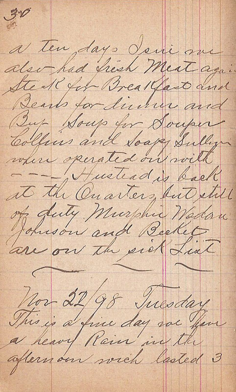 a ten days Isue we also had fresh Meat and Beans for dinner and Beef Soup for Souper Sullivan where operated on with - - - - Hustead is back at the Quarters but still of duty Murphie Wodan Johnson and Becket are on the sick List