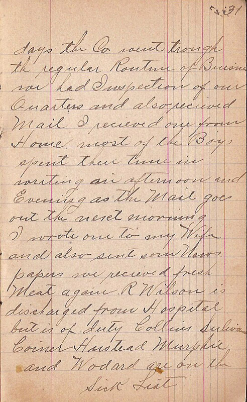 days the Co went trough the regular Routine of Buisnes we had Inspection of our Quarters and also recieved Mail I recieved one from Home most of the Boys spent their time in writing in afternoon and evening as the Mail goes out the nexct morning I wrote one to my Wife and also sent some News papers we recieved fresh Meat again R Wilson is discharged from Hospital but is of duty Collins Sulivan Coiner Hustead Murphie and Wodard are on the Sick List |