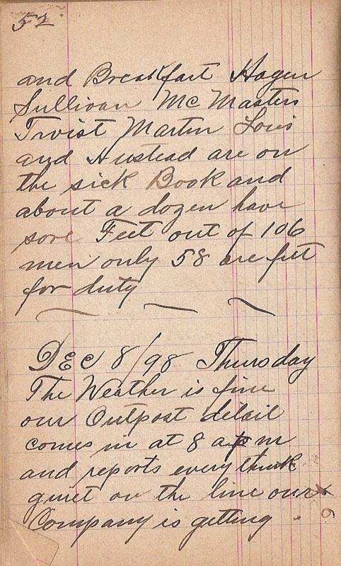 and Breakfast Hagen Sullivan McMasters Twist Martin Louis and Hustead are on the sick Book and about a dozen have sore Feet out of 106 men only 58 are fitt for duty
