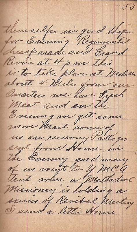 themselfes in good shape for Evening Regimental dressparade and Grand Review at 4 pm this is to take place at Malette about 4 Miles from our Quarters we have Fresh Meat and in the Evening we get some more Mail some of us are recieving Packages sent from Home in the Evening good many of us went to YMCA tent where a Methodist Missionary is holding a services of Revival Meeting I send a letter Home