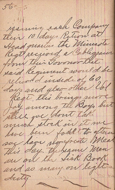 issuing each Company their 10 days Ration at Headquarters the Minesota Regt recieved a Cablegram from their Govenor that said Regiment would be relieved inside of 60 days and also other Vol Regt this brings more Joy among the Boys but still we dont take much stock in it we have been foolt to often we have no fresh Meat this day the same Men are on the Sick Book and as many on light duty Dec 11/98 Sunday