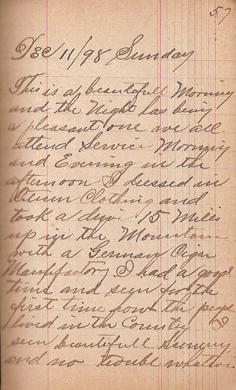 This is a beautifull Morning and the Night has being a pleasant one we all attend Service Morning and Evening in the afternoon I dressed in Citizen Clothing and took a drive 15 Miles up in the Mountain with a German Cigar Mansifactory I had a good time and seen for the first time how the people lived in the Country I seen beautifull Scenerry and no trouble whatever