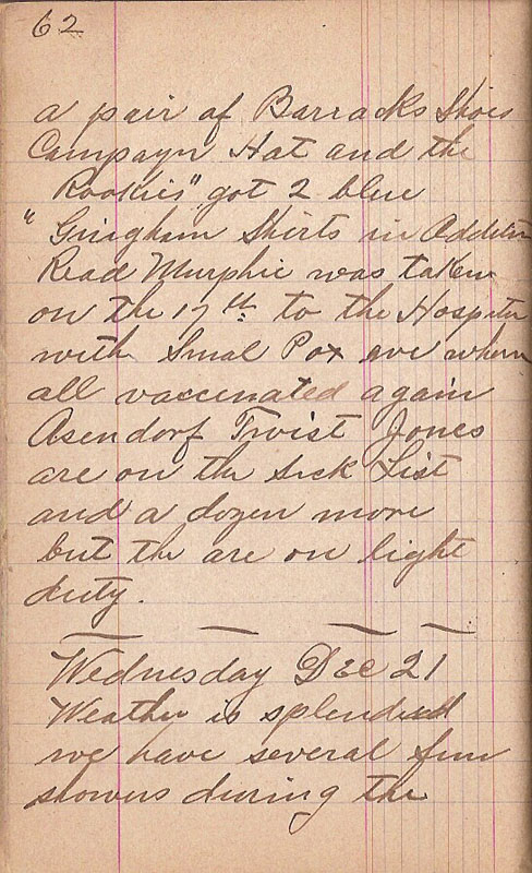 a pair of Barracks Shoes Campagn Hat and the "Rookies" got 2 blue Gringham Shirts in Addition Read Murphie was taken on the 17th to the Hospital with Smal Pox we where vaccinated again Asendorf Twist Jones are on the Sick List and a dozen more but the are on light duty
